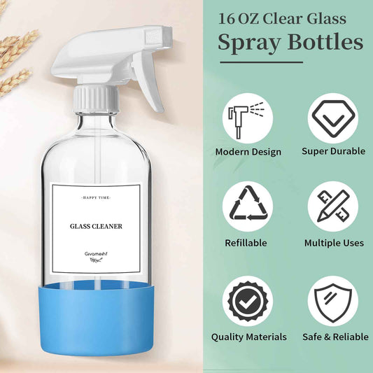 GIVAMEIHF 2 Pack Glass Spray Bottles with Silicone Sleeve,16oz Clear Glass Spray Bottles Refillable Empty Bottle with Adjustable Nozzle,Spray Bottle for Essential Oils,Cleaning Solutions,Pets,Hair