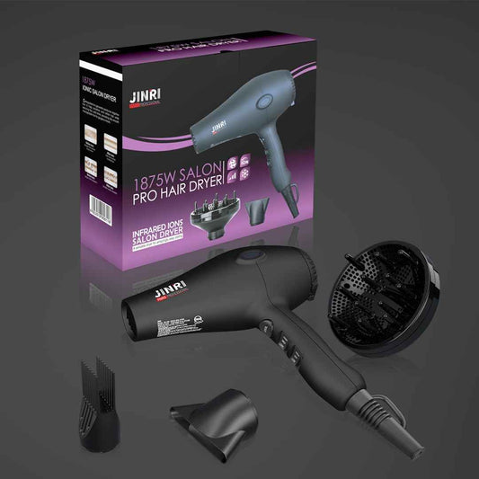 JINRI Hair Dryer, 1875W, 3 Heat & 2 Speed, with Diffuser, with Concentrator, Detachable Air Intake, Ionic Technology & Infrared - Black, Hanging Strap, Non-Foldable JR-108