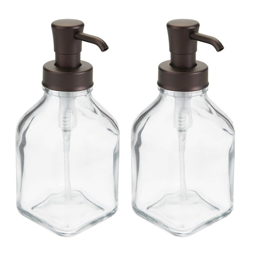 mDesign Square Glass Refillable Liquid Soap Dispenser Pump Bottle for Bathroom Vanity Countertop, Kitchen Sink - Holds Hand Soap, Dish Soap, Hand Sanitizer, Essential Oils - 2 Pack - Clear/Bronze