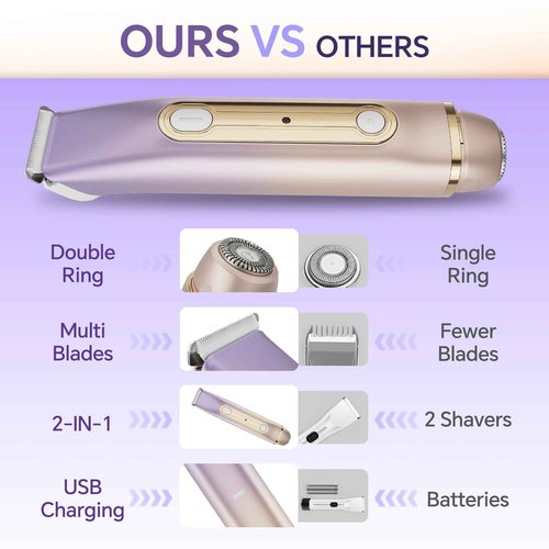 2-in-1 Electric Bikini Trimmer & Facial Shaver for Women, Painless Hair Removal with Ceramic Blades, IPX7 Waterproof Cordless Razor for Shower Use, Type-C Fast Charging, Gift for Women(Purple)