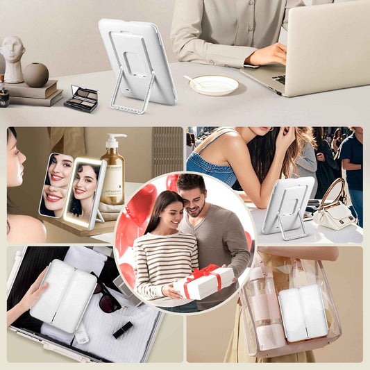 GOMIPURU Vanity Mirror with Lights, Lighted Makeup Mirror with 30X/10X/5X Magnification, Rechargeable Trifold Mirror with 3 Color & Adjustable Brightness, Travel Makeup Mirror with Lights for Desk