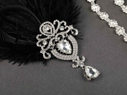 SWEETV 1920s Feather Headpiece Black, Womens Ostrich Feather Crystal Headband, Great Gatsby Hair Accessories for Women, Ribbon Tie