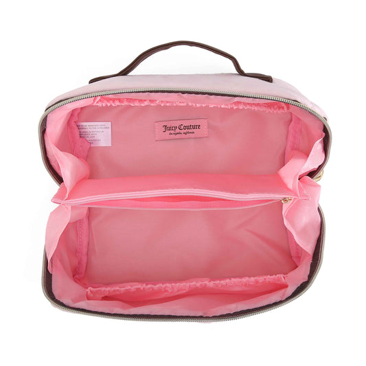 Juicy Couture Pink Brown Makeup Bag Cosmetics Organizer Travel Essentials Cross Zip Velour Rhinestone Brown Handle