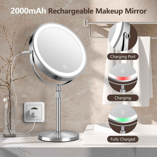 10x Large Lighted Makeup Mirror, Rechargeable 8" Height Adjustable Vanity Mirror, 1x/10x Magnifying Mirror with 3 Color, Brightness Adjustable, 360° Rotation Double Sided Mirror, Gift for Her(Nickel)