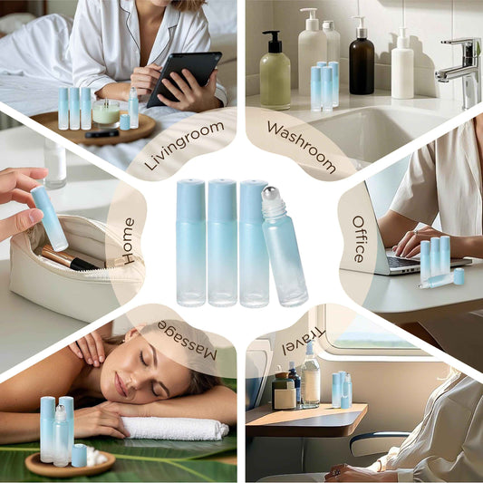 SESENSE Essential Oil Roller Bottles, 10ml Thick Glass Perfume Roller Bottles with Funnel Opener and Dropper Colored Glass Empty Bottles with Stainless Steel Roller Balls (Blue, 4 Pack)