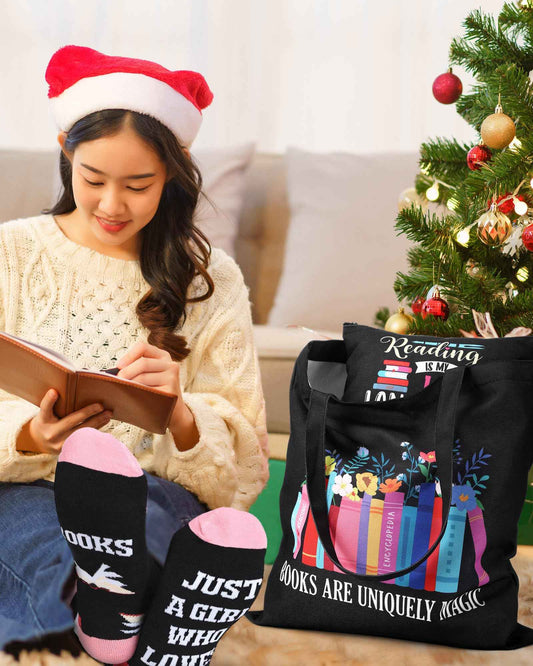 Huhumy 3 Pcs Book Lover Gifts for Women Library Tote Bag Novelty Book Socks Cosmetic Bag Christmas Bookish Gifts for Reading Lovers Librarian Colleagues Teachers Friends Bookworms Authors