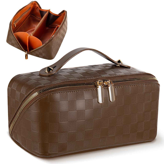Abiudeng Travel Makeup Bag,Large Capacity Toiletry Bag Cosmetic Bags for Travel Essentials,Waterproof Portable Pouch Open Flat Makeup bag Organizer with Divider and Handle(Checkered-Brown)