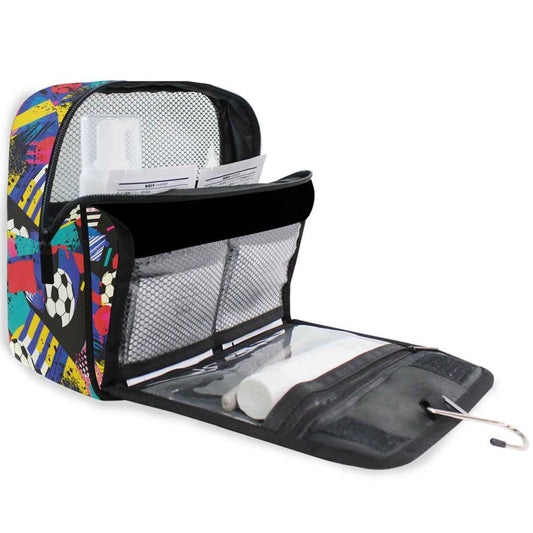 Hanging Travel Toiletry Bag Kit Boys Makeup Case Cosmetics Organizer for Men Women (Inspired Soccer Bright Colors)