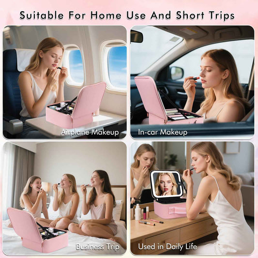 Junyaoxuan Travel Makeup Bag with LED Mirror,Travel Makeup Organizer with Removable LED Mirror,Makeup Case with Lighted Mirror 3 Color Setting,Pink