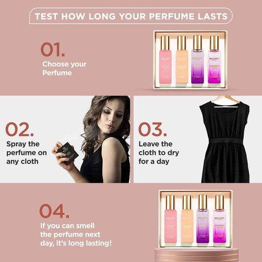 BellaVita Luxury Women's Perfume Gift Set (4x20ml) | Notes of Floral, Sweet, Spicey Red Fruit, Vanilla & Musk | DATE, SENORITA, GLAM & ROSE | French Parfum Collection Gift Set