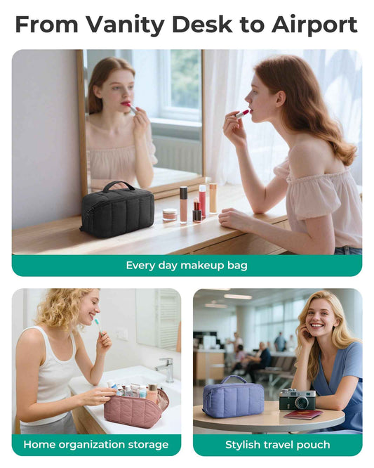 BAGSMART Travel Makeup Bag for Women, Portable Water-resistant Cosmetic Case, Puffy Padded Make Up Organizer Pouch, Open Flat Toiletry Bag for Toiletries, Brushes, Pink