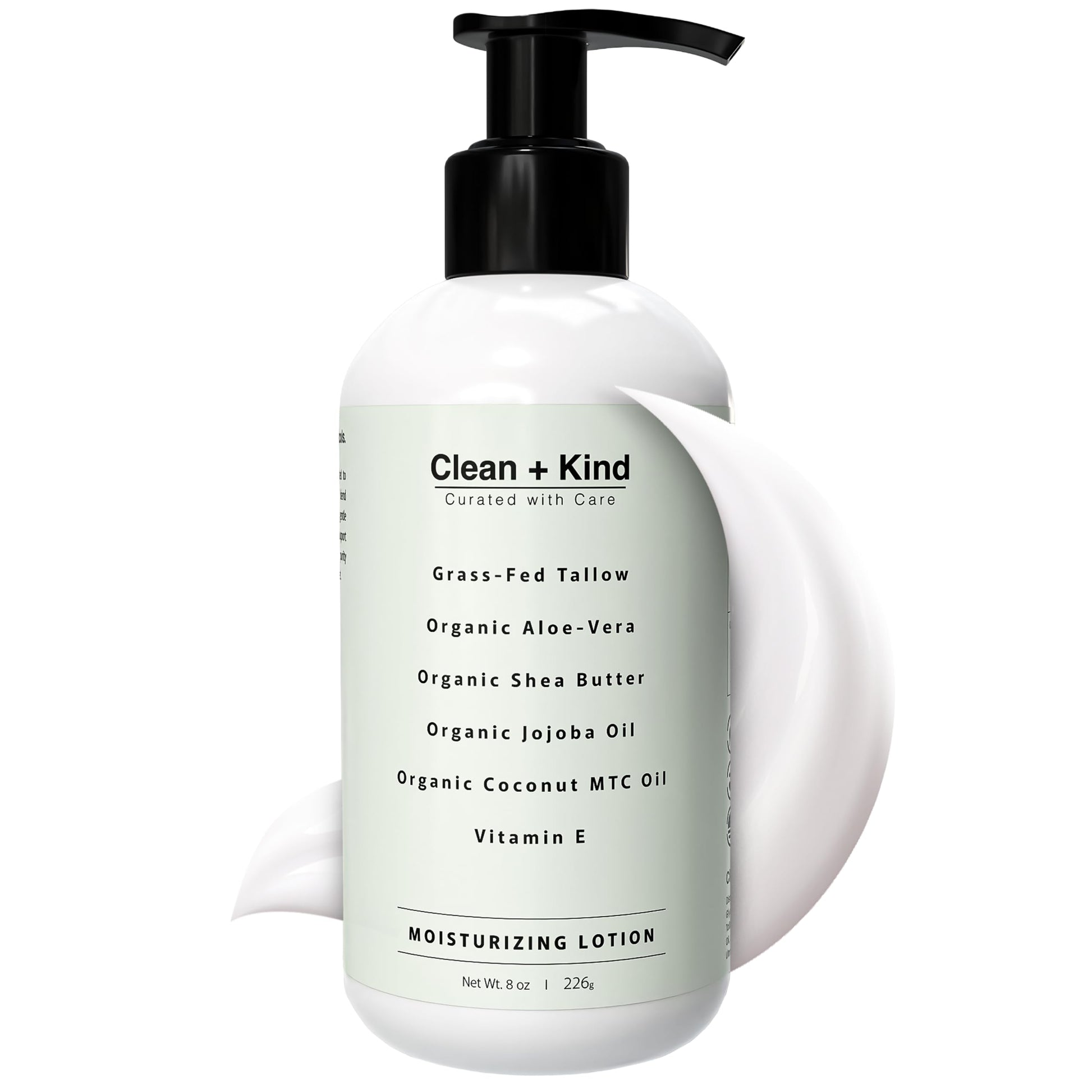 Details: Clean + Kind Daily Moisturizing Lotion is crafted to deeply hydrate, soothe, and protect your skin using only clean, nutrient-rich ingredients. Our unique blend of grass-fed tallow, aloe vera, shea butter, jojoba oil, MCT oil, and vitamin E provides powerful hydration while supporting the skin’s natural moisture barrier. Unlike heavy creams, this lotion absorbs quickly, leaving your skin soft, smooth, and refreshed without greasy residue. Perfect for daily use, it helps improve the appearance of dry, flaky skin, rough patches, and uneven tone, while calming irritation for sensitive skin. Formulated with clean, safe, and transparent ingredients, this lotion is free from synthetic additives, parabens, sulfates, and petroleum. Proudly made in the USA, Clean + Kind brings you a moisturizer you can feel good about using every day.
