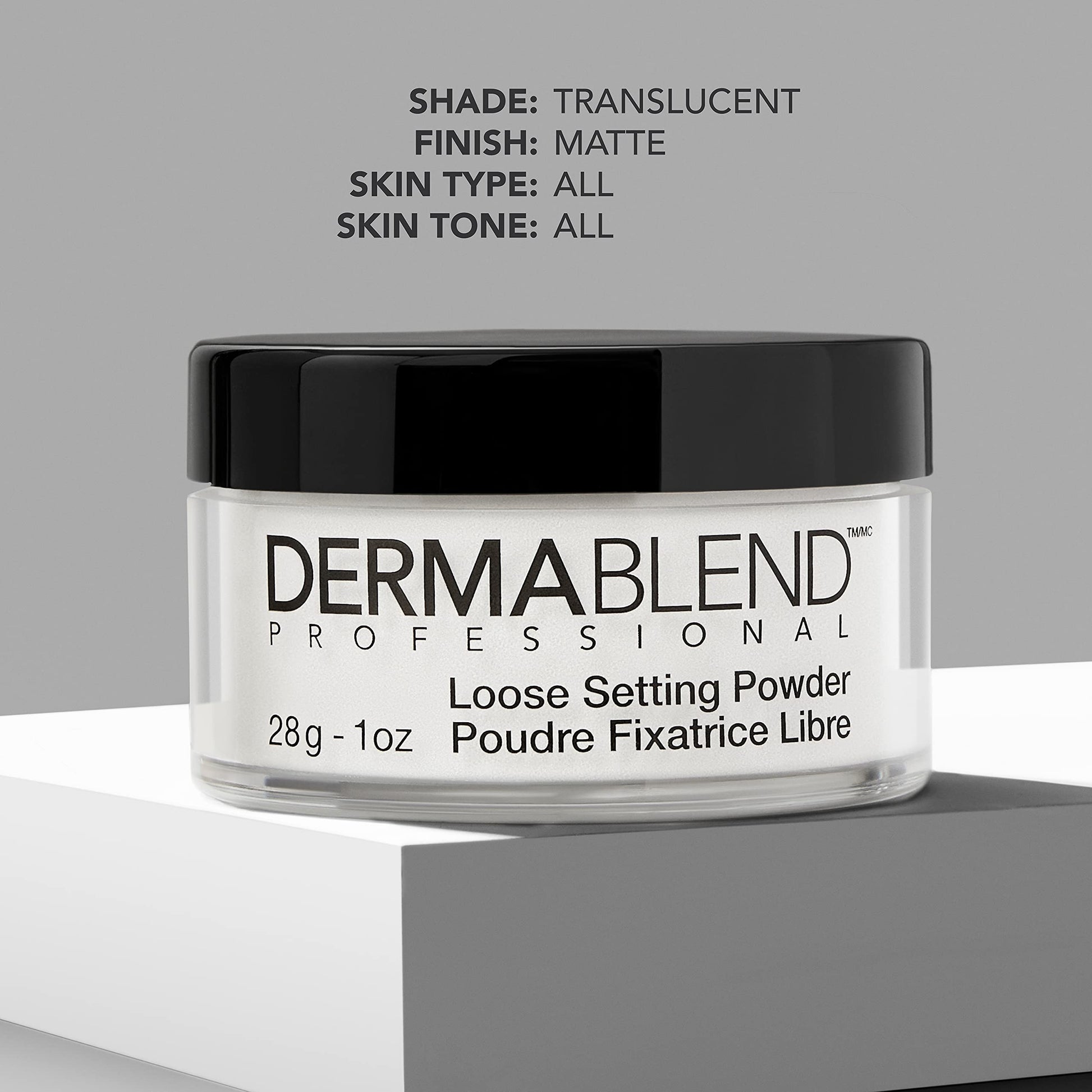 #1 Dermatologist Recommended Coverage Brand Dermablend brings you Loose Setting Powder, the ultimate step to lock in makeup for up to 16 hours of smudge and transfer-resistant wear. This weightless micronized powder is an essential to flawlessly set foundation and concealer while mattifying skin. Dermablend Loose Setting Powder is transparent upon application and works for all skin types and skin tones. Cruelty-free. Product Benefits: • Formulated to flawlessly lock in Dermablend foundation and concealer for up to 16 hours of smudge and transfer-resistant wear • Mattifies complexion with sheer translucence SKIN SECURITY STANDARDS Dermatologist standards + #1 DERMATOLOGIST RECOMMENDED COVERAGE BRAND + NON-COMEDOGENIC + SENSITIVE SKIN-TESTED + ALLERGY TESTED Formula standards + CRUELTY-FREE + HIGH-PERFORMANCE PIGMENTS + FRAGRANCE-FREE + SLS-FREE + TRICLOSAN-FREE + PHTHALATE-FREE