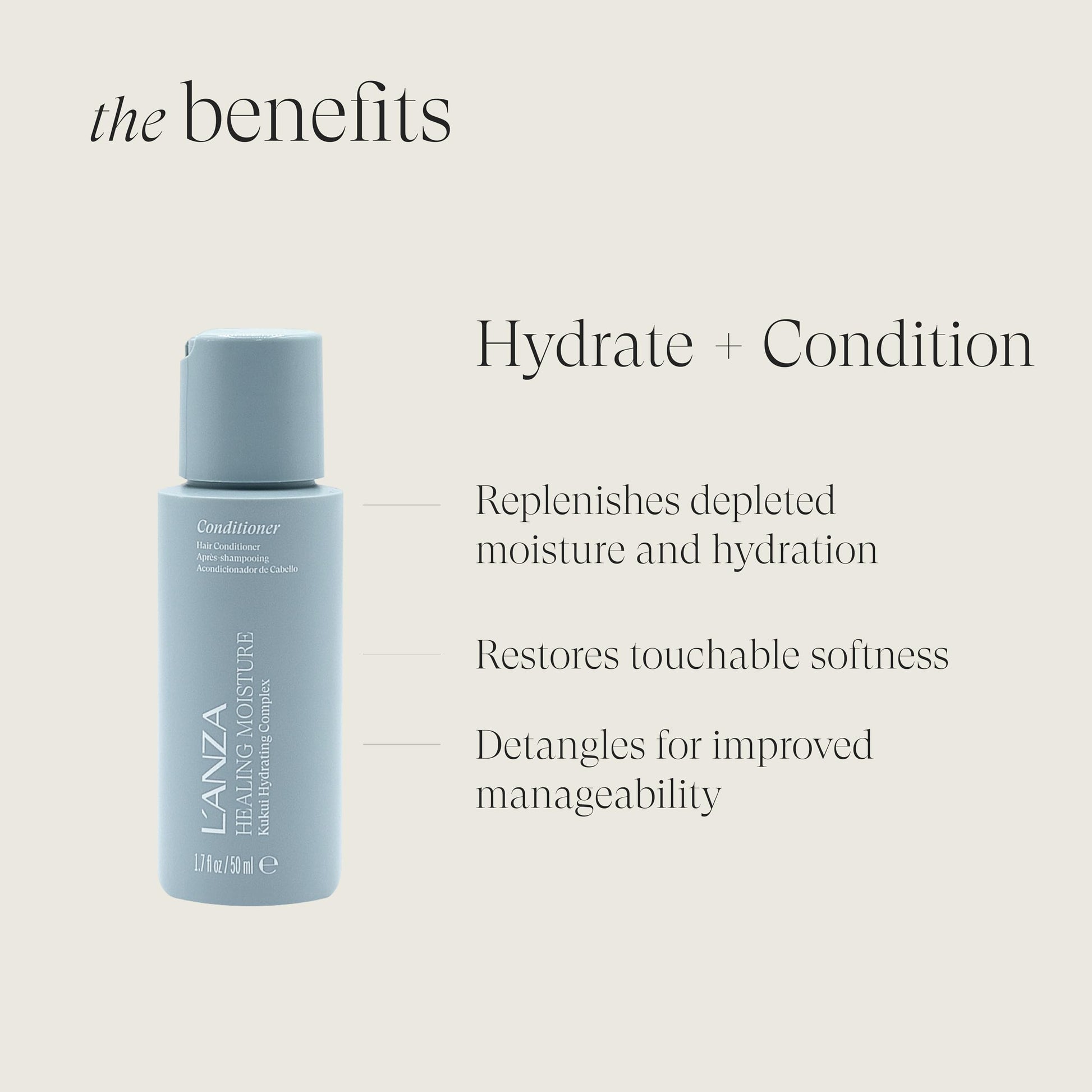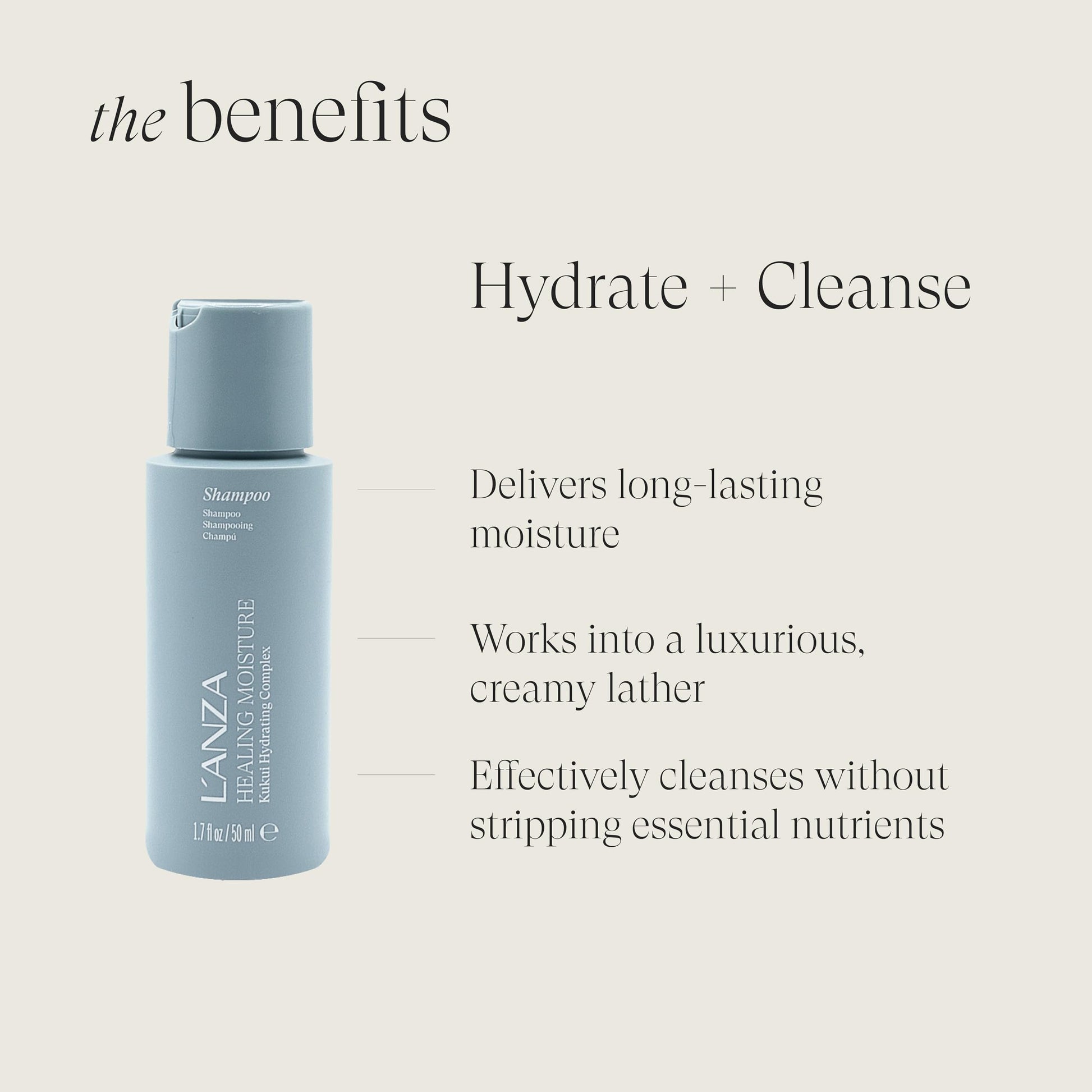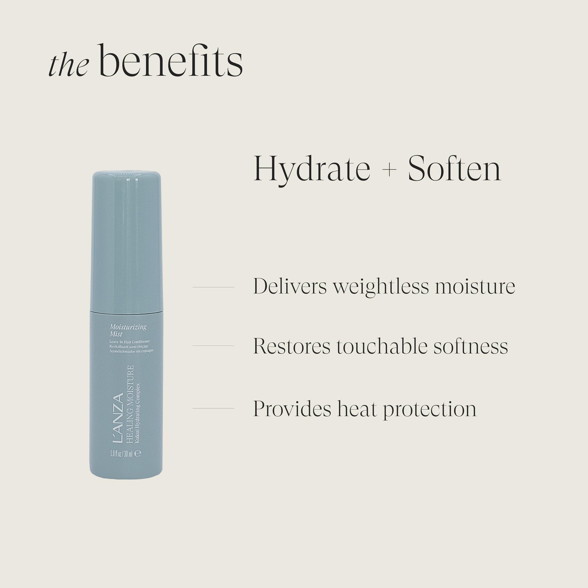 Details: L’ANZA Healing Moisture Mini Try Me & Travel Size Kit instantly hydrates and revives dry, dull, or brittle hair with weightless moisture and shine. This nourishing leave-in mist detangles, softens, and smooths strands while reducing frizz and restoring elasticity. Infused with Tahitian Tamanu Nut Oil and Polynesian Gugo Bark, it replenishes hydration deep within the hair fiber, helping prevent breakage and dryness. The lightweight, non-greasy formula protects against heat and environmental stress while leaving hair touchably soft, silky, and radiant. Perfect for daily use to refresh and condition all hair types. Lightweight leave-in conditioning mist for dry, dehydrated hair Instantly hydrates, detangles, and softens without buildup Enriched with Tahitian Tamanu Nut Oil and Polynesian Gugo Bark Restores elasticity, smoothness, and healthy shine Provides heat and humidity protection to fight frizz and dryness Ideal for all hair types—curly, fine, wavy, or straight Cruelty free, sulfate free, paraben free Moisturizing Shampoo 1.7 fl oz, Conditioner 1.7 fl oz & Mist Spray 1 fl oz