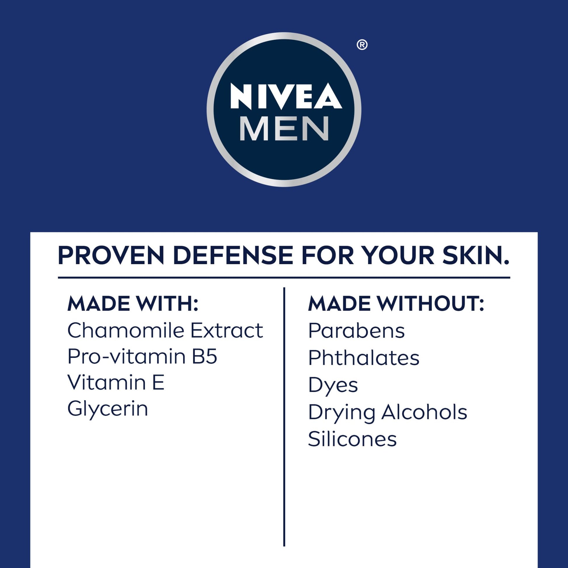 Details: NIVEA MEN Sensitive Soothing Post Shave Balm is a proven defense for your skin. This extra gentle, alcohol free post shaving balm is specially formulated for men with sensitive skin, to help moisturize and protect your skin from dryness caused by/after shaving. NIVEA Sensitive Post Shave Balm for Men is enriched with Vitamin E, Pro-Vitamin B5 and Chamomile extract to help calm and hydrate sensitive skin. A lightweight, fast-absorbing, non-sticky and non-greasy formula helps provide your skin with long-lasting moisturization for the ultimate skin comfort. This men’s aftershave balm fights the five signs of shave irritation: burning, micro cuts, dryness, tightness and stubble itch. Free of parabens, dyes and drying alcohols, this after shave balm is suitable for daily use. This shaving balm is a key part of a skin care and beard care routine and pairs well with NIVEA MEN Sensitive Shave Gel, Sensitive Face Wash and Sensitive Face Lotion with Broad Spectrum SPF 15 Sunscreen as part of a daily skincare regimen. To use, apply this aftershave balm for men liberally all over the face, beard and neck area after shaving or cleansing. With daily use of this after shave for men, skin feels comfortable, smooth, resilient and healthy-looking.