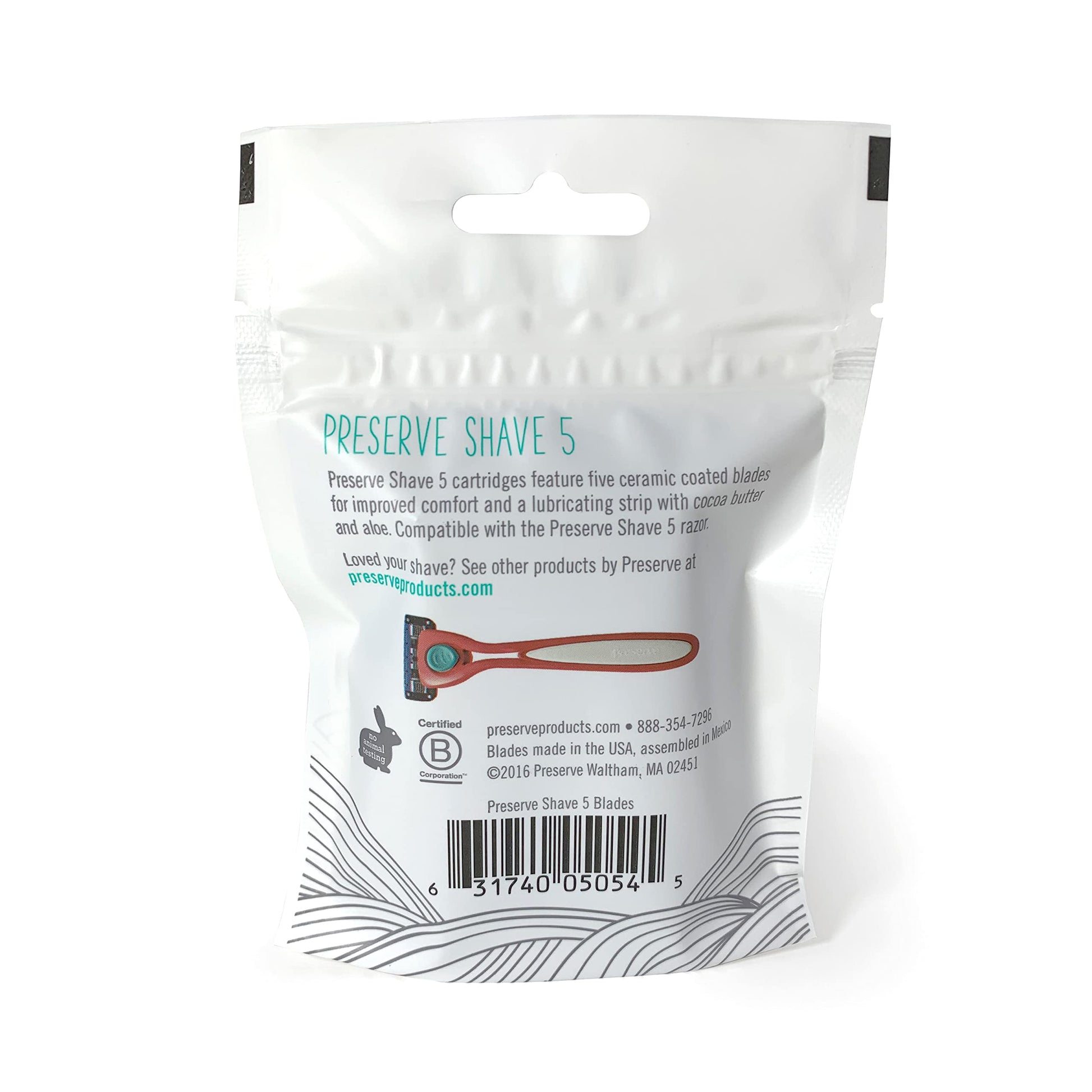 Details: Preserve Shave 5: Made with love and recycled plastic Preserve Shave 5 is a next generation razor that is beautifully designed to offer an extraordinary shave while being light on the earth. What does it mean to create a unisex razor? For us, it meant designing with you in mind, no matter who you are or how you shave. Preserve Shave 5 is designed to not only accommodate but work well and feel good with the various grips used by shavers of all stripes. Make your blade last longer To ensure that your blades last as long as possible and reduce your environmental impact, rinse and dry after each use to preserve blade sharpness and longevity and store outside of the shower.