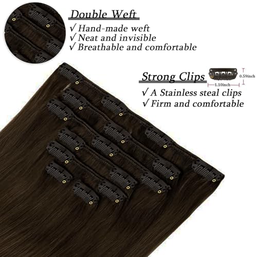 Savasana Clip in Hair Extensions Real Human Hair Straight 7 Pcs Hair Extensions Double Weft Thick Dark Brown 16 Inch 120g