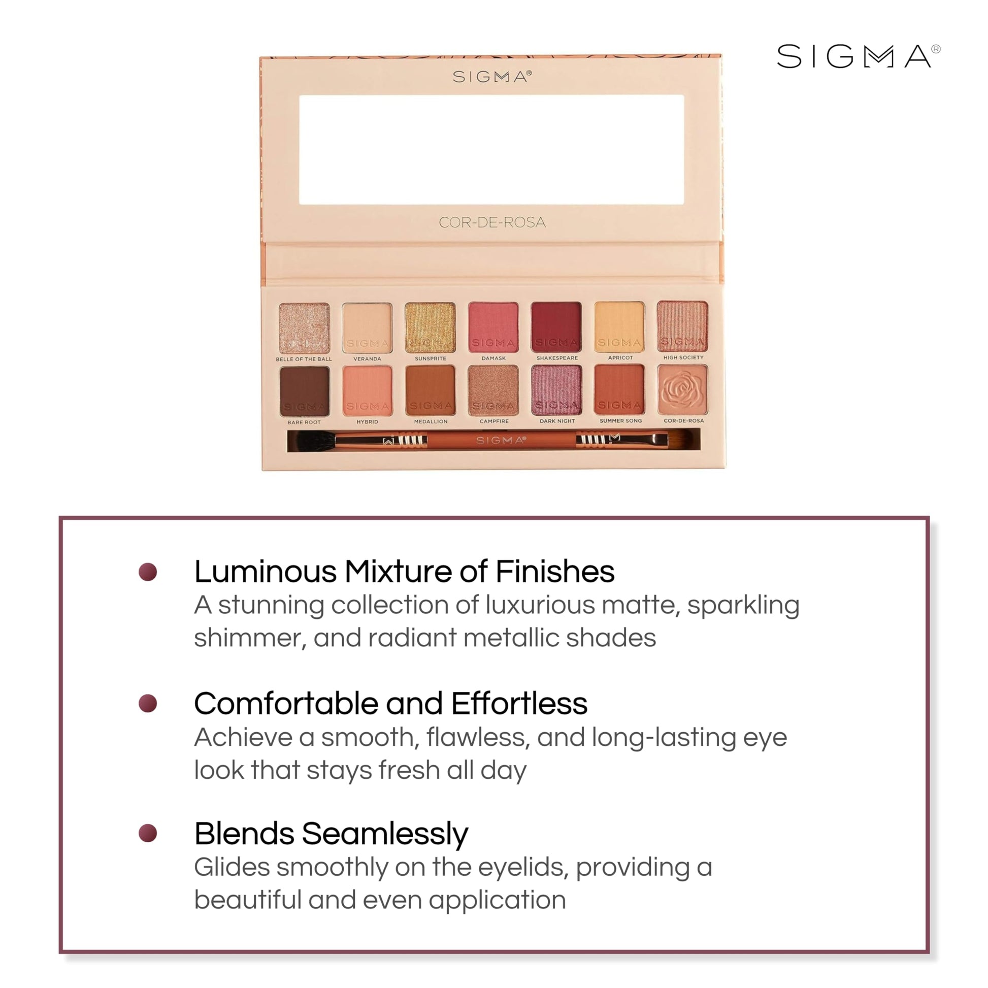 Sigma Beauty Cor-De-Rosa Eyeshadow Palette - 14 Warm Eyeshadow Shades in Matte, Shimmer and Metalic Finishes - Highly Pigmented Vegan Eye Makeup Palette - Clean Beauty Products