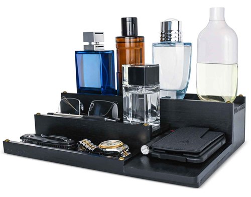 Manzano Essentials Cologne Organizer for Men, Bamboo Wood 4 Tier Display Stand with 2 Hidden Compartments, Perfume, Vanity, Dresser, EDC Organizer, Rustic Black