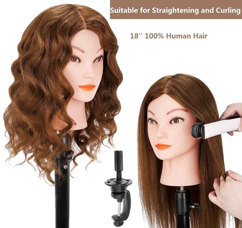 Mannequin Head with 100% Real Human Hair, Beauty Star Manikin Doll Head for Hair Styling, Cosmetology Hairdressing Training Practice Head with Clamp Stand and Braiding Accessories Kit (18" Dark Brown)