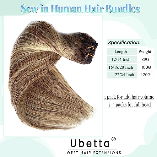 Sew in Hair Extensions Real Human Hair, 16 Inch 100G Weft Bundles Ombre Brown and Blonde Balayage Highlights Weave for Women