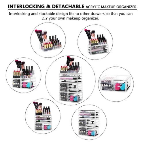 Banvikon Acrylic 4 Pack Makeup Organizer with 11 Drawers, Clear, Stackable Cosmetic Organizer For Lipstick, Jewelry and Makeup Brushes, Beauty Storage With Drawers For Dresser And Bathroom.