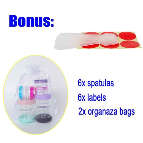 Wopanxye 6 Pieces 10G/10ML Multi-color Frosted Container Jars with Inner Liner for Bath Lotion, Toners, Lip Balm, Creams, Slaves, Scrubs, Oils, Makeup Sample Jar, BPA Free, Gift Spatulas & Labels