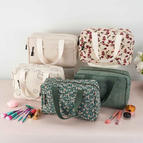 ZOEMTIU Large Makeup Bag for Women Corduroy Cosmetic bag Make up Bags Zipper Pouch with handle Cosmetic Organizer Toiletry Bag for Travel Storage (Checkered Darkbrown)