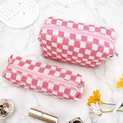 ZLFSRQ 2Pcs Checkered Pencil Case Cute Pencil Pouch for Teens Pink Checkered Makeup Bag Travel Cosmetic Bag Set Cute Preppy Makeup Pouch for Purse Portable Zippered Skincare Toiletry Bags Organizer